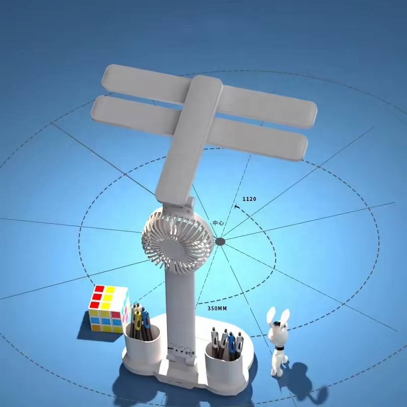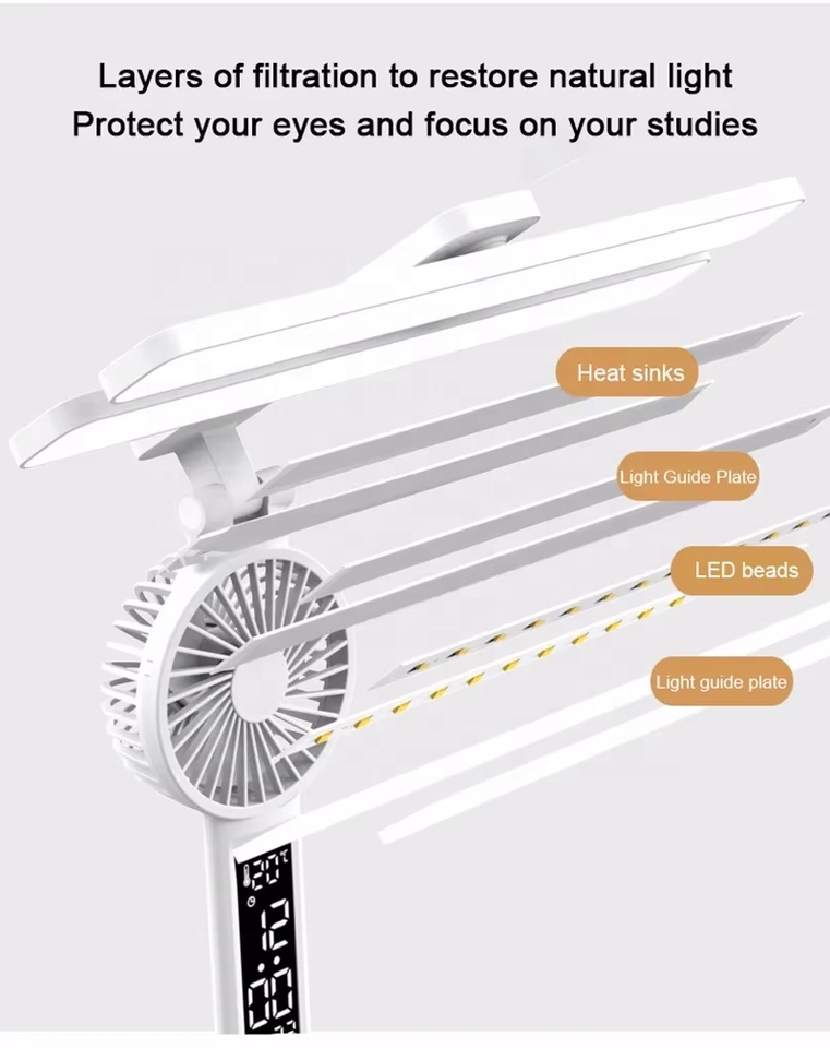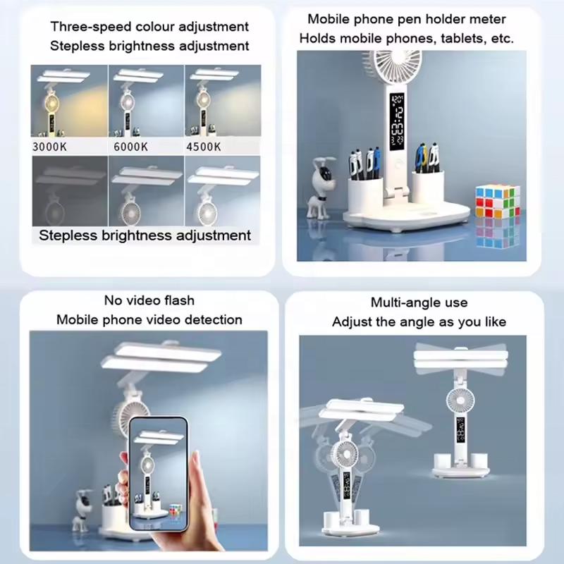 Horloge LED pliable, protection des yeux, lampe de lecture à intensité variable, lampe de bureau avec ventilateur, porte-stylo