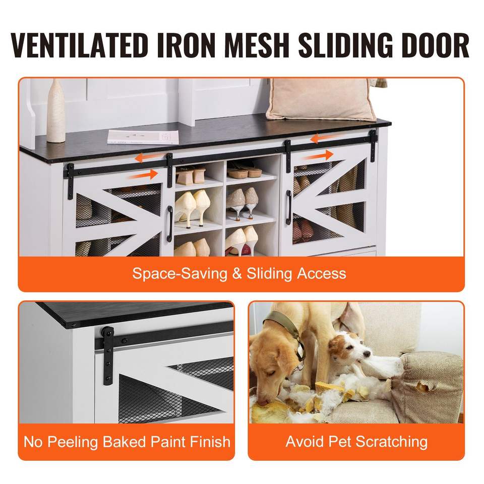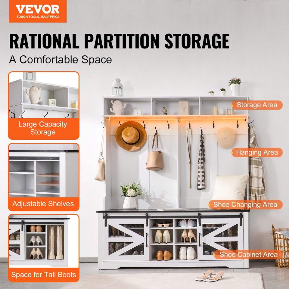 Porte-manteau LED avec banc d'entrée et rangement pour chaussures, banc de 59 pouces de large pour buanderie avec étagères réglables
