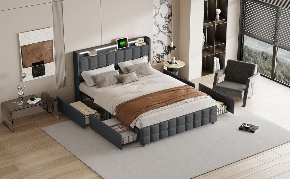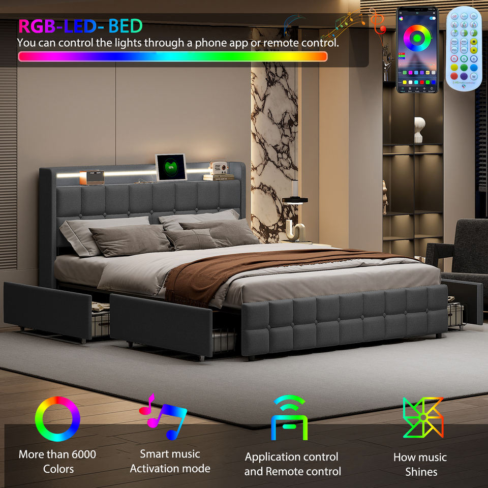 Lit à lumière LED king size avec rangement 4 tiroirs
