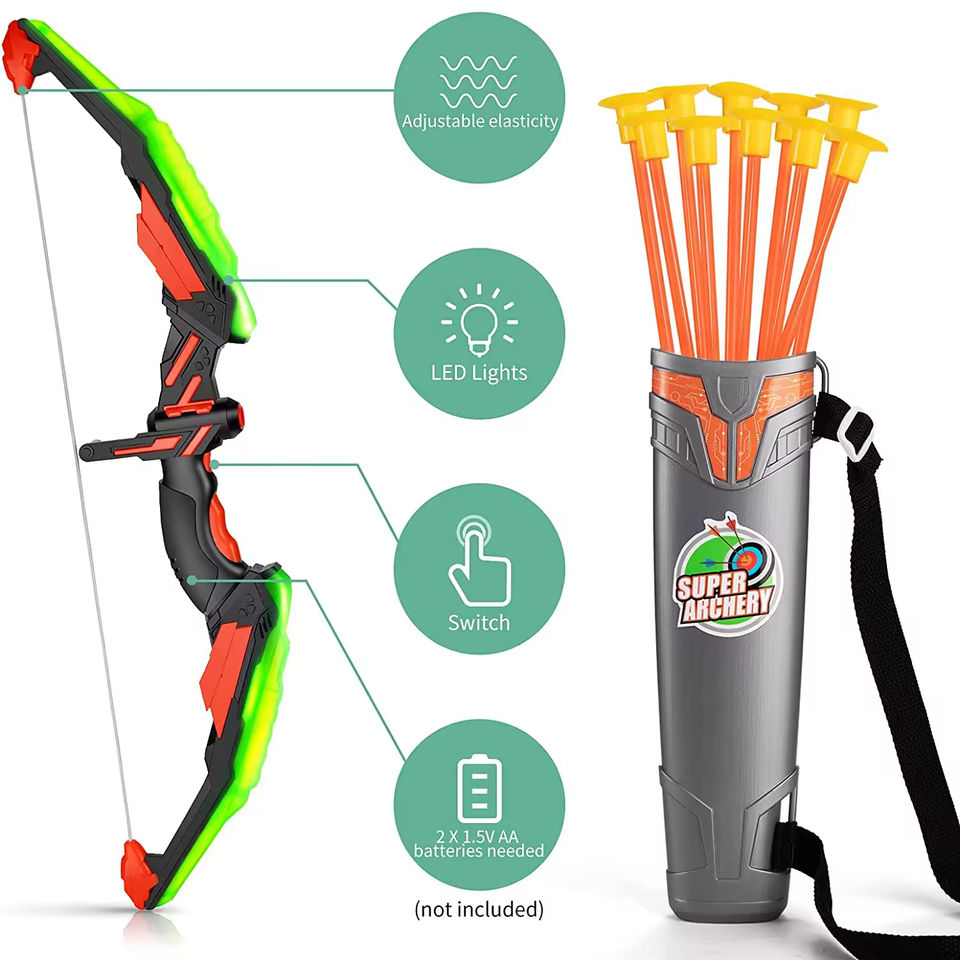 Ensemble d'arc et de flèches pour enfants en plastique lumineux à LED, 10 flèches, carquois, cible, jouets de sport de plein air