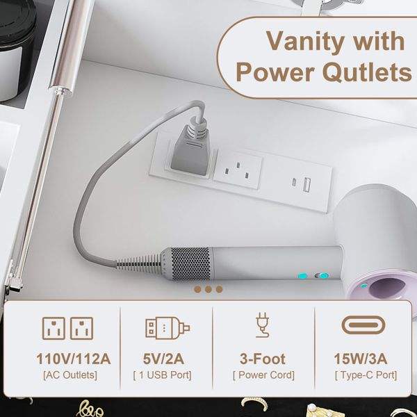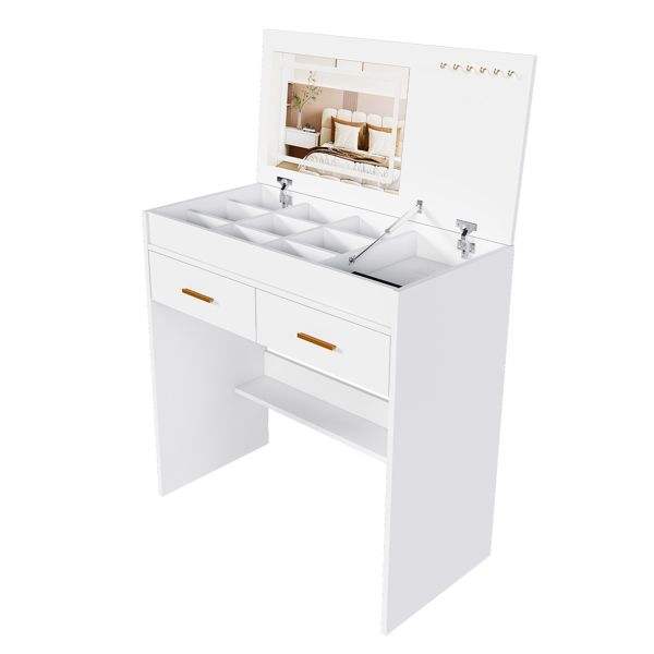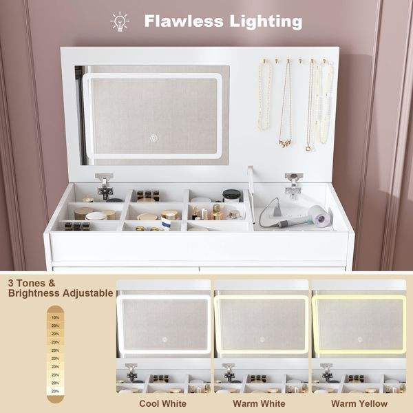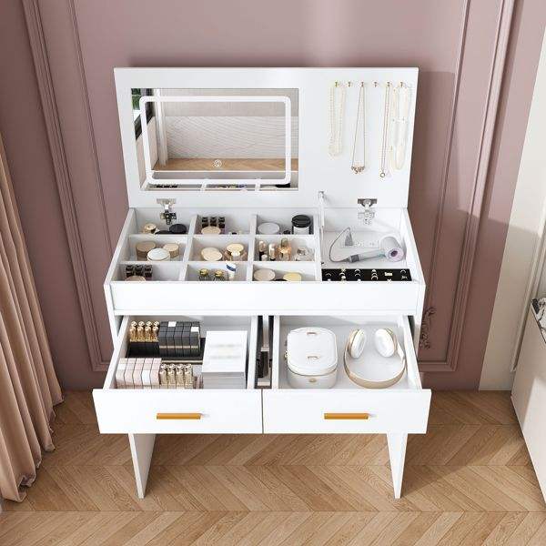 Coiffeuse à miroir LED avec dessus rabattable, 2 tiroirs, rangements ouverts, crochets et prise intégrée