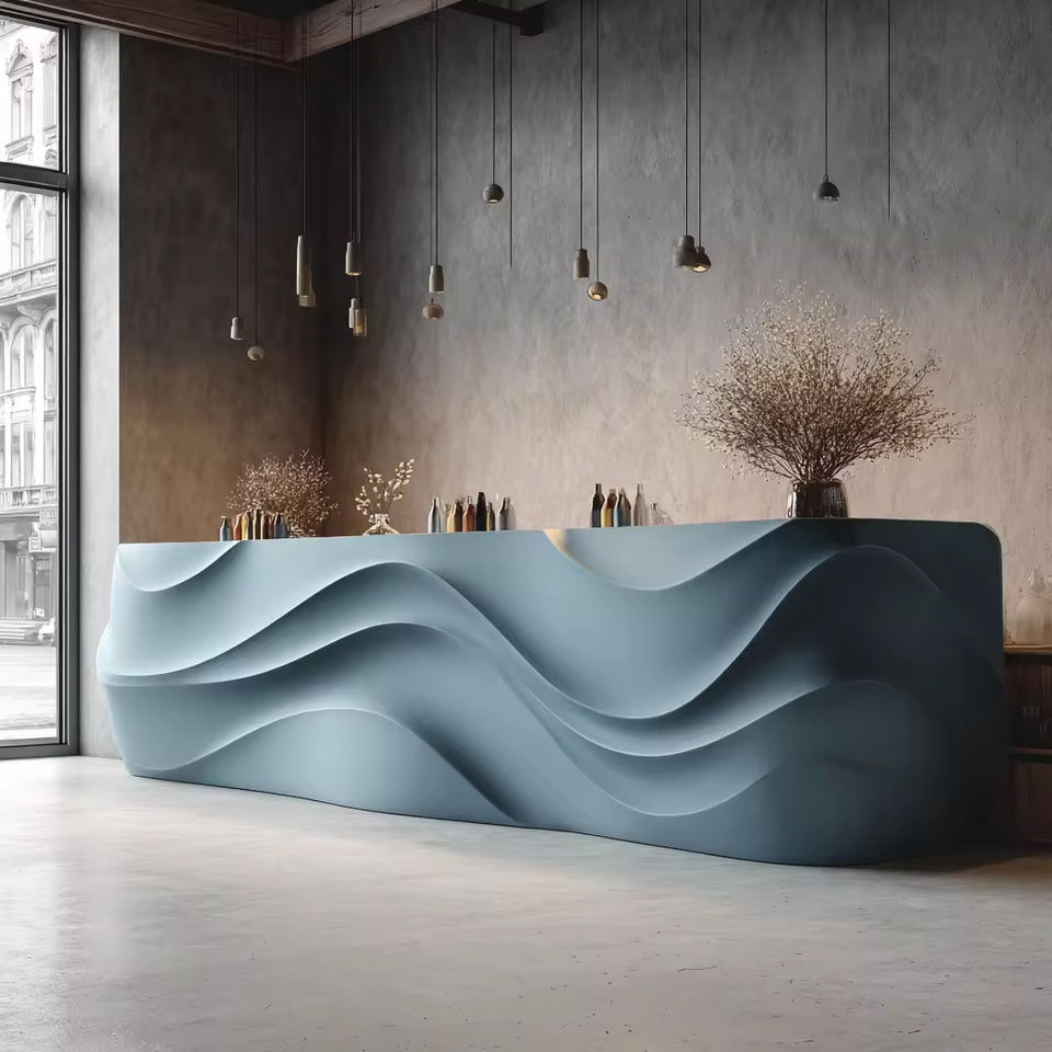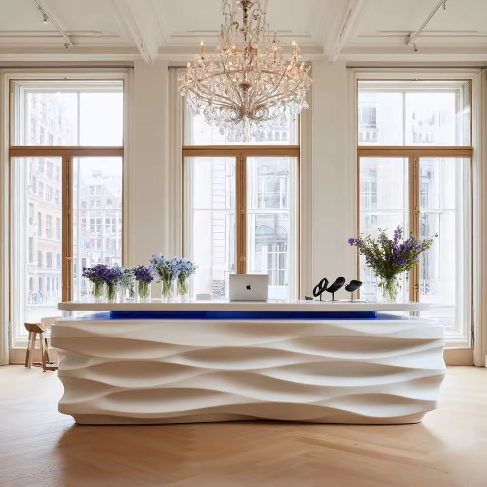 Bureau d'accueil imprimé en 3D blanc éclairé par LED, comptoir incurvé pour les intérieurs commerciaux de luxe