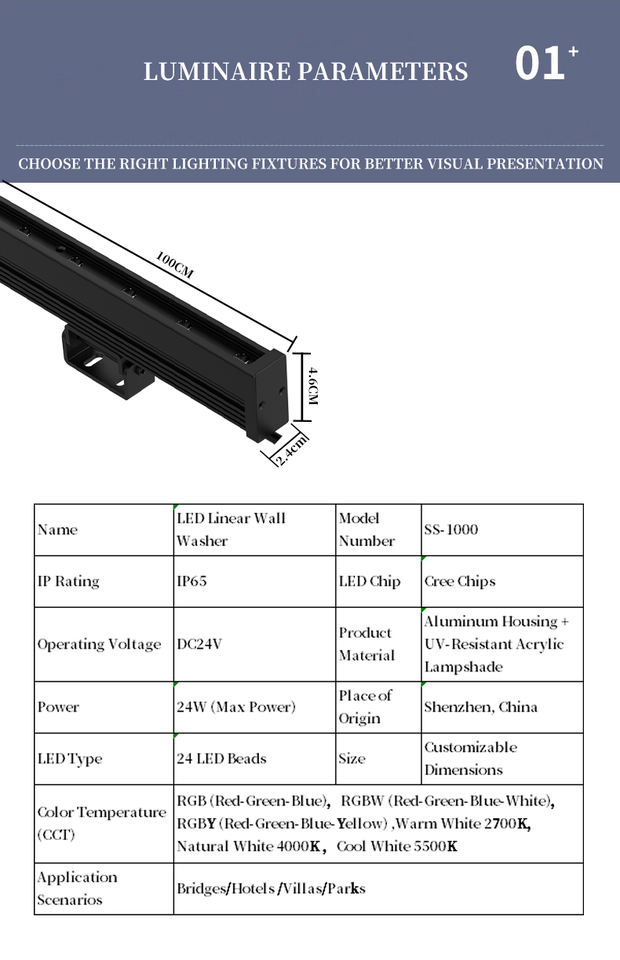 Lampe murale LED longue bande IP65 pour l'extérieur en alliage d'aluminium DC24V SS-1000 un éclairage décoratif à haute luminosité