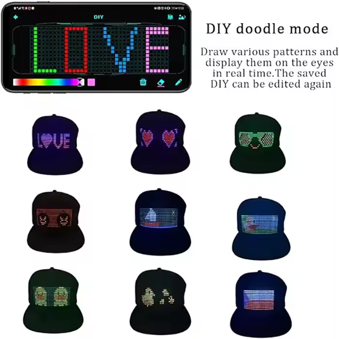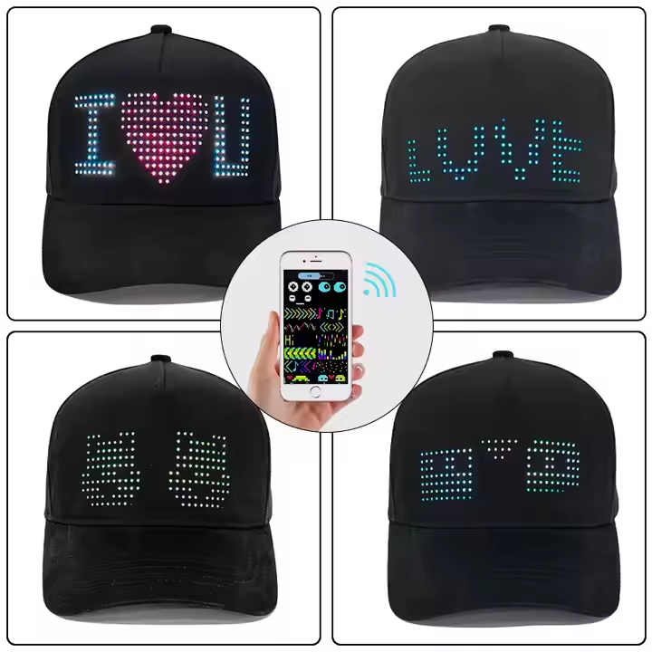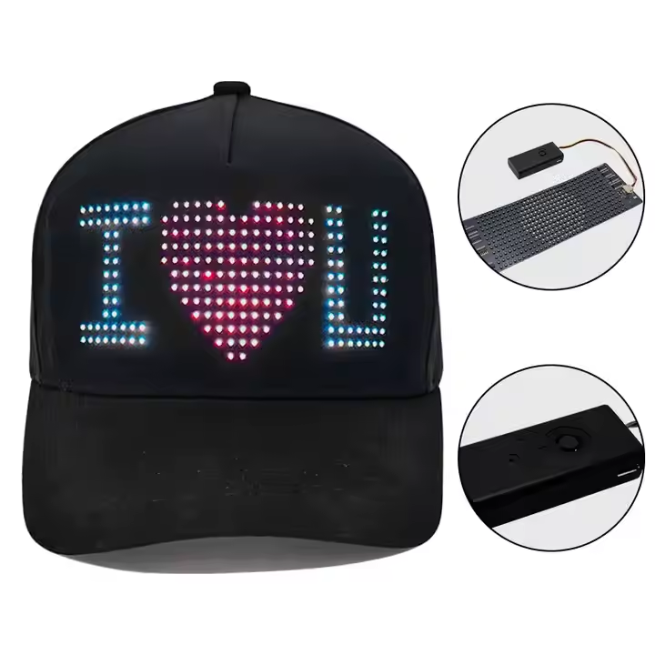 Casquette de baseball publicitaire à LED avec affichage défilant, rechargeable, texte et images modifiables, application de visualisation