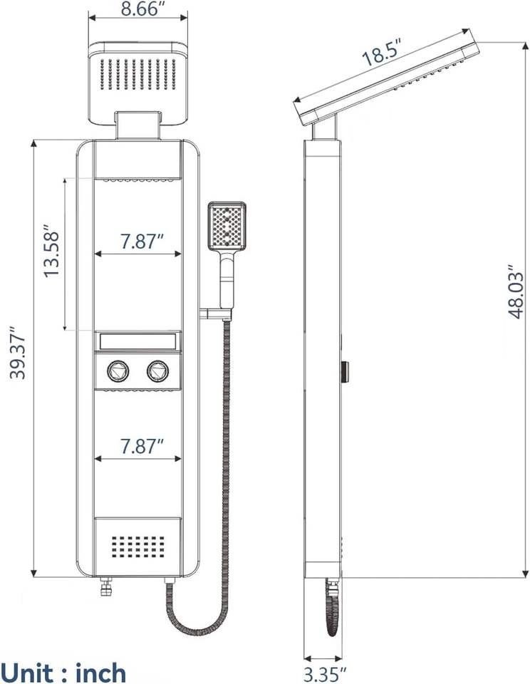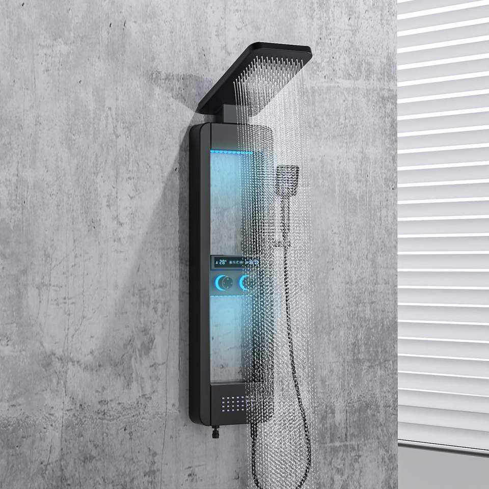 Système de douche à panneau LED avec étagère, pomme de douche pluie et système de massage par jets d'eau, acier inoxydable pour salle de bain