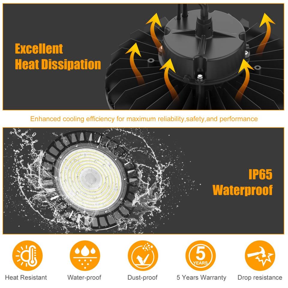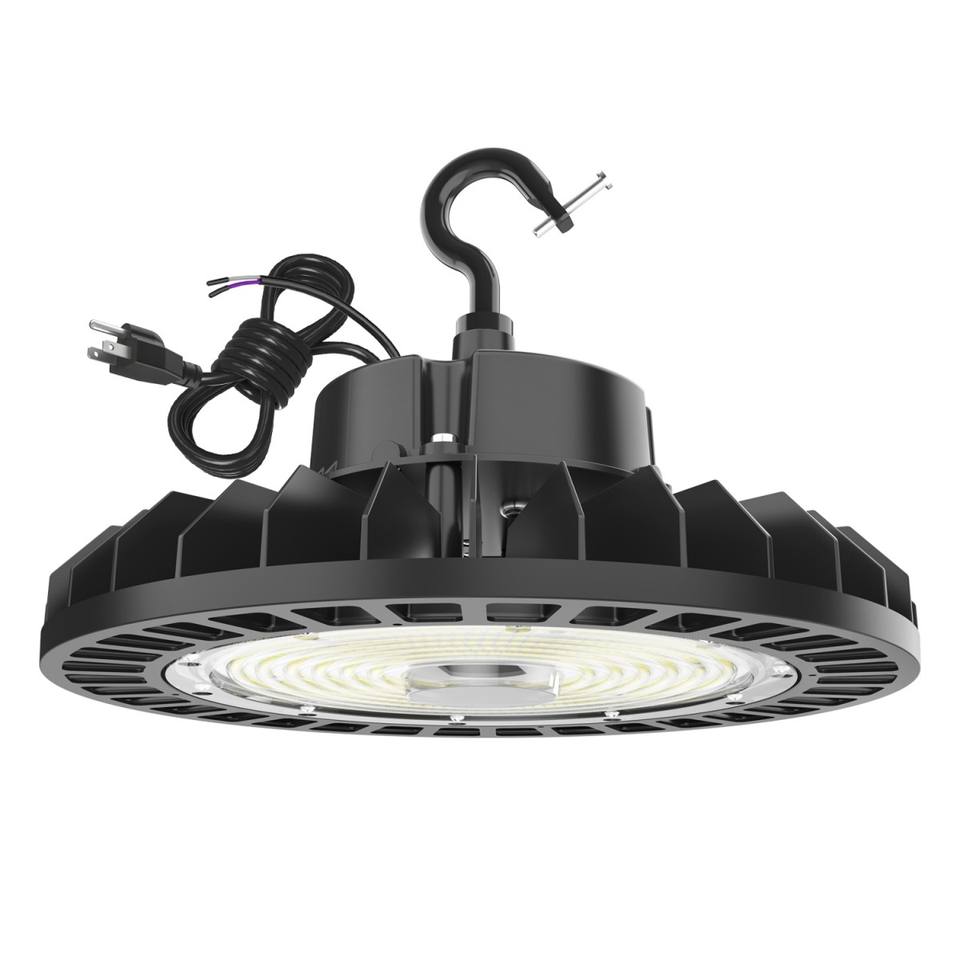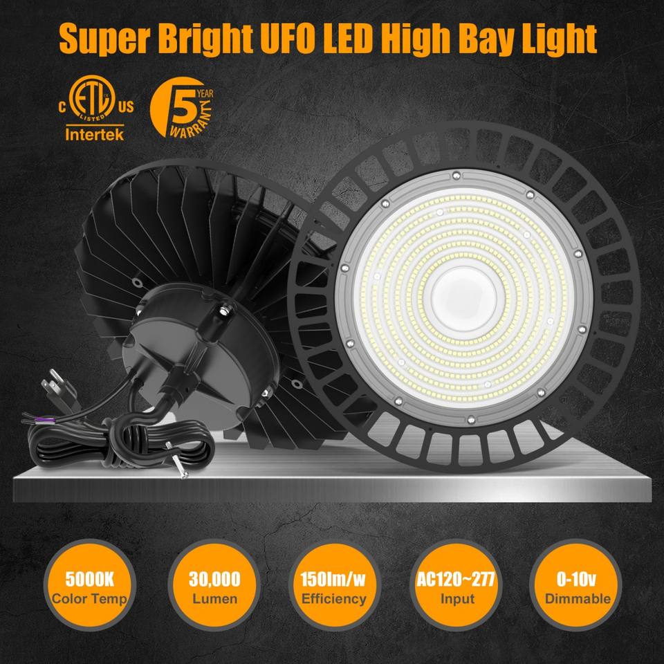 Projecteur LED UFO High Bay 150W 200W Dimmable 0-10V avec câble de 10 pieds, prise US, crochet de suspension et corde de sécurité pour entrepôt, usine, grange, magasin