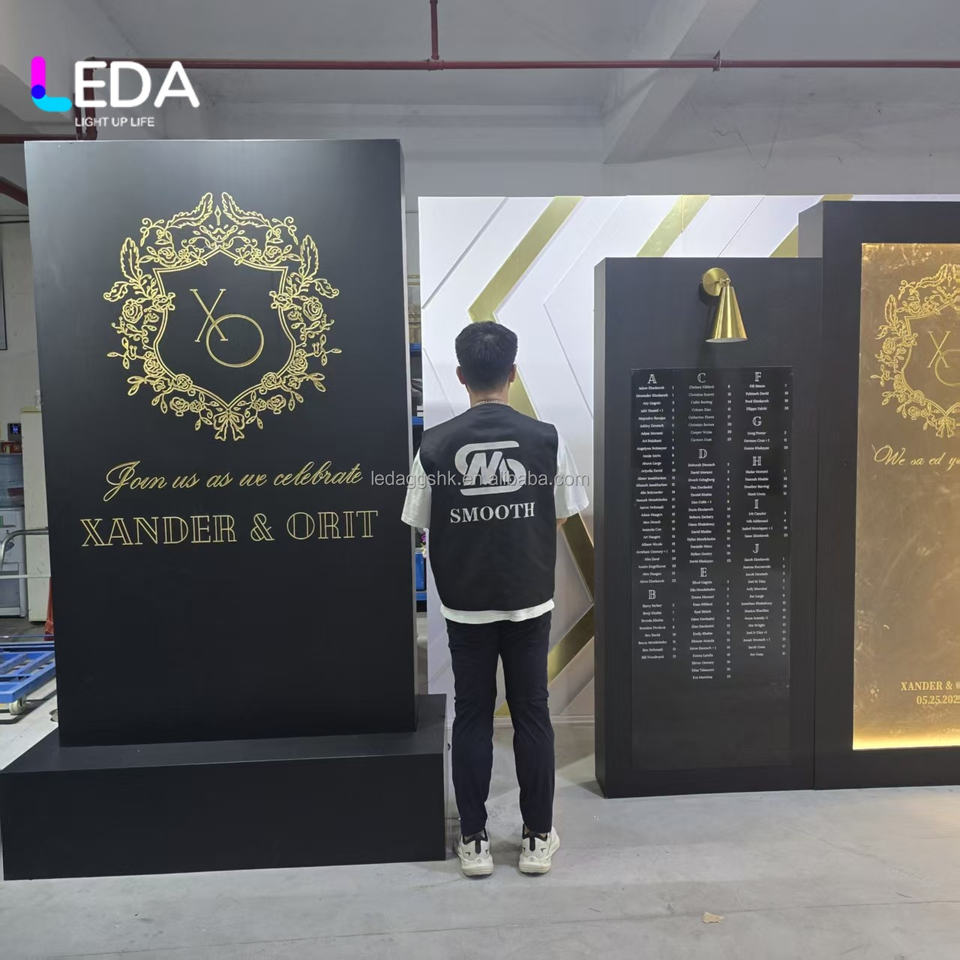 Décorations de mariage modernes personnalisées LEDA, fonds de scène en acrylique noir effet miroir, liste des noms, panneau de bienvenue, réception de mariage, événements