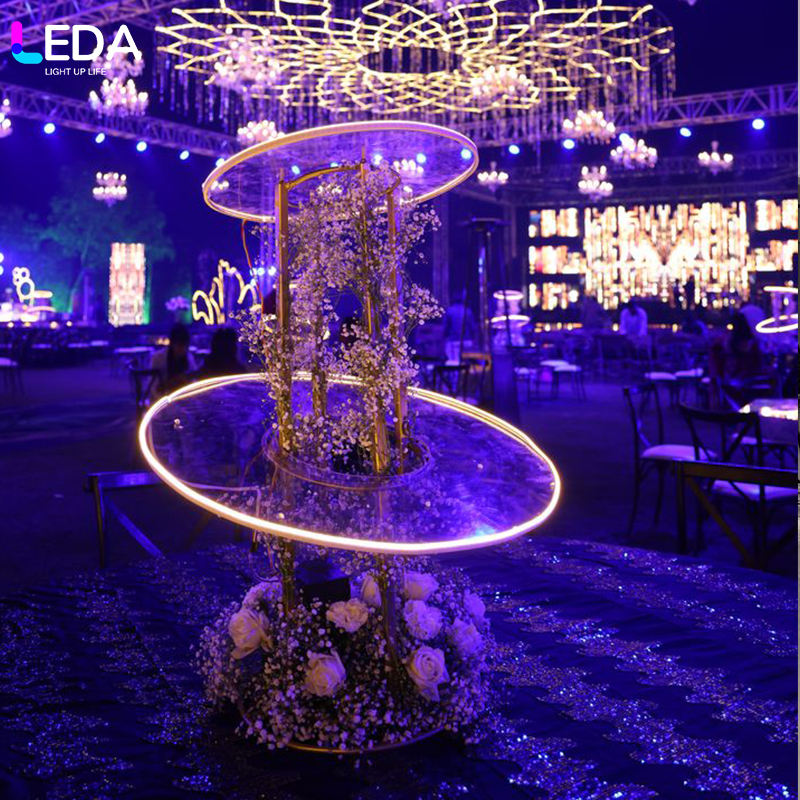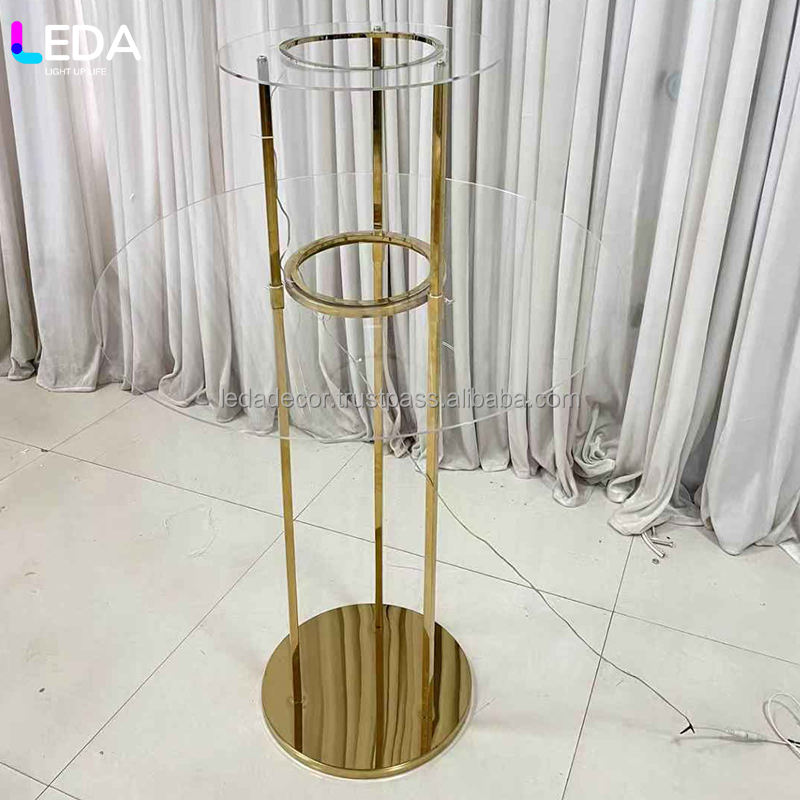 Support de fleurs de table en acier inoxydable personnalisé LEDA avec bande lumineuse LED blanche et base dorée pour la décoration de table de mariage