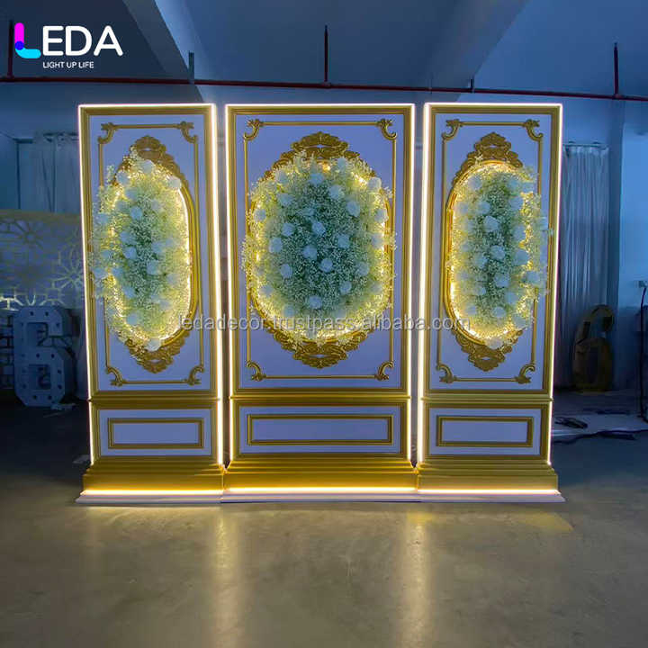 LEDA Nouveau design Arche dorée Style amovible Toile de fond en acrylique Mur LED avec fleurs de gypsophile pour la décoration de fête de mariage