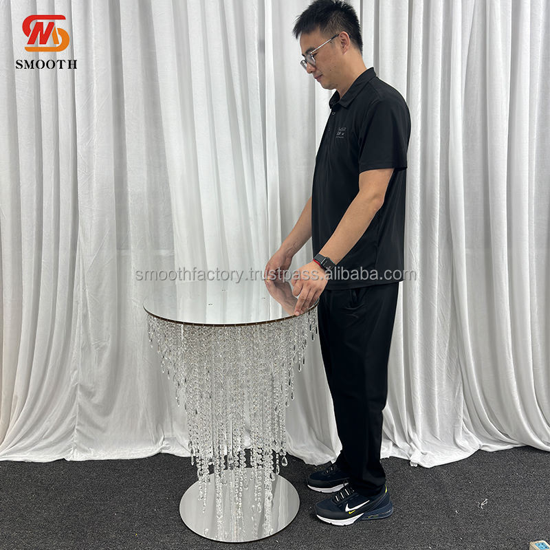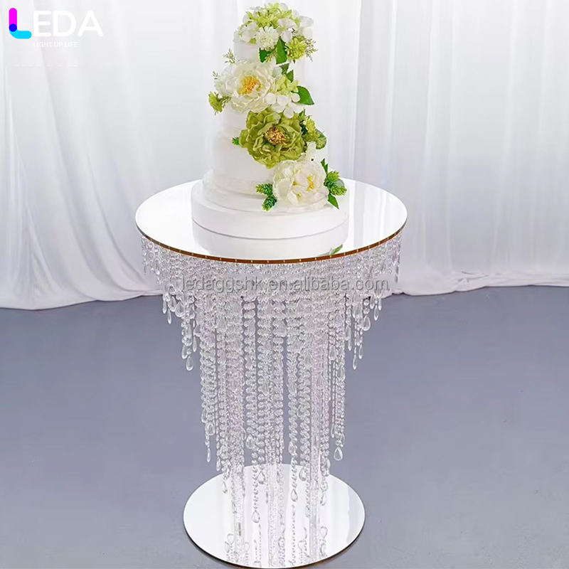 Table de présentation de gâteau de mariage LEDA avec décorations en cristaux et pompons, socle rond transparent