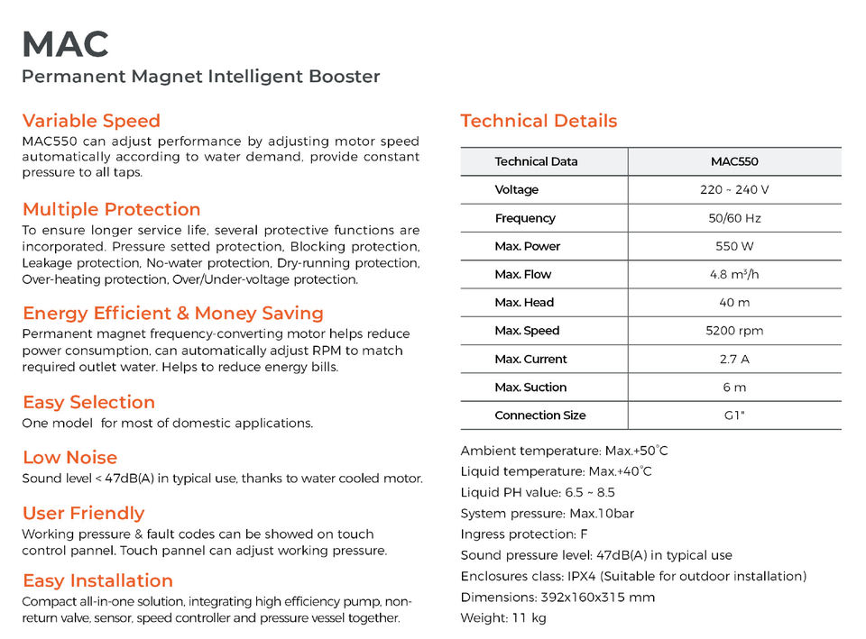 Pompe à eau de surpression intelligente à aimant permanent LEO MAC550