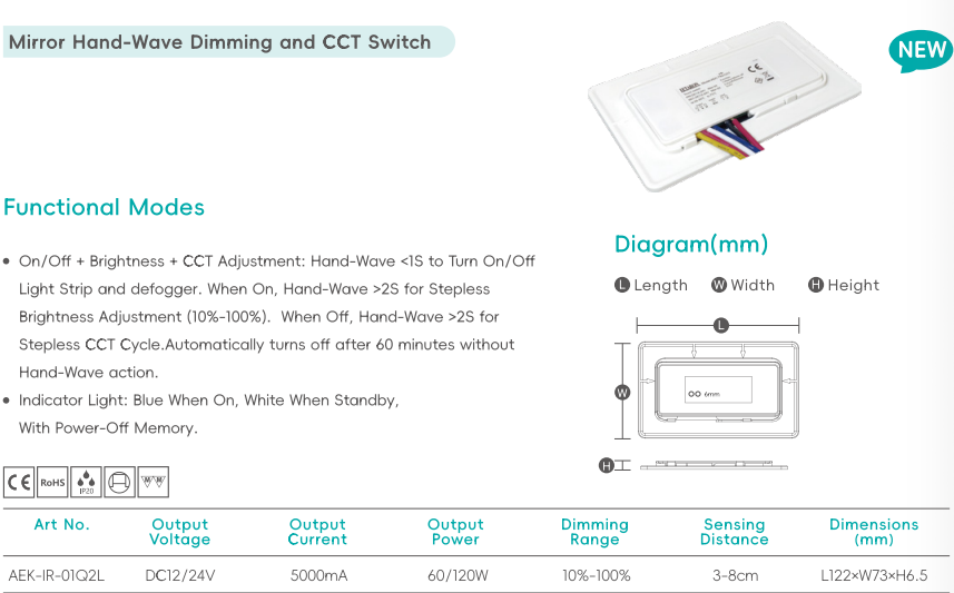 LETARON Nouveau capteur de mouvement manuel à gradation continue CCT pour éclairage LED de miroir de salle de bain
