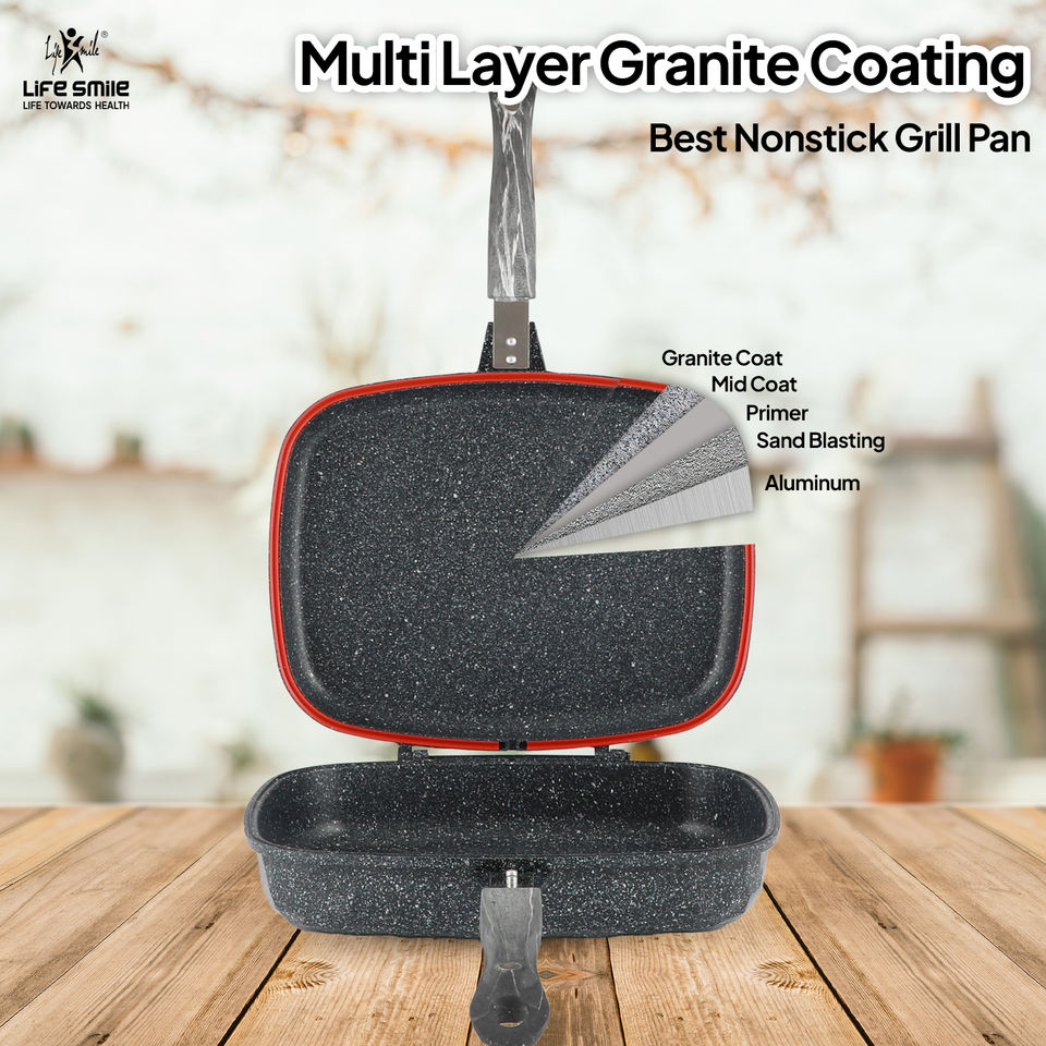 Poêle à frire carrée double face en aluminium moulé sous pression LIFE SMILE, 32 cm, revêtement antiadhésif en granit, pour grillades au gaz, grilles, poêles à griller