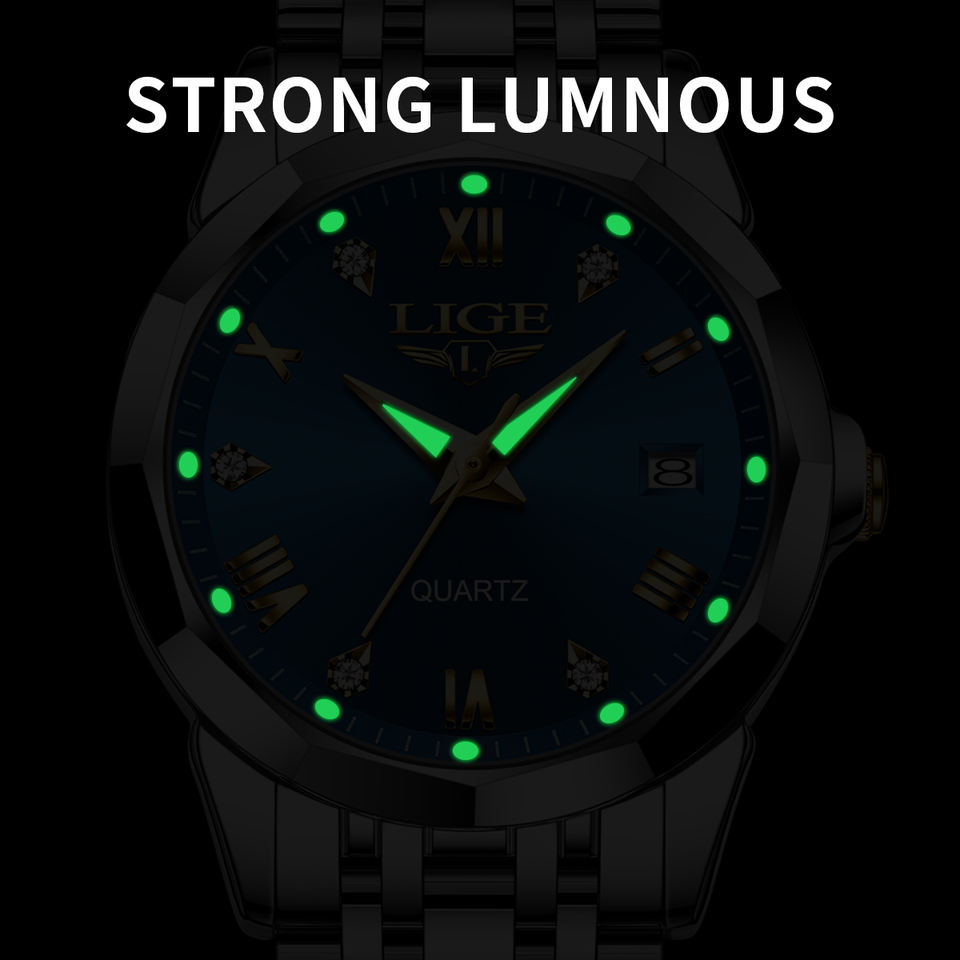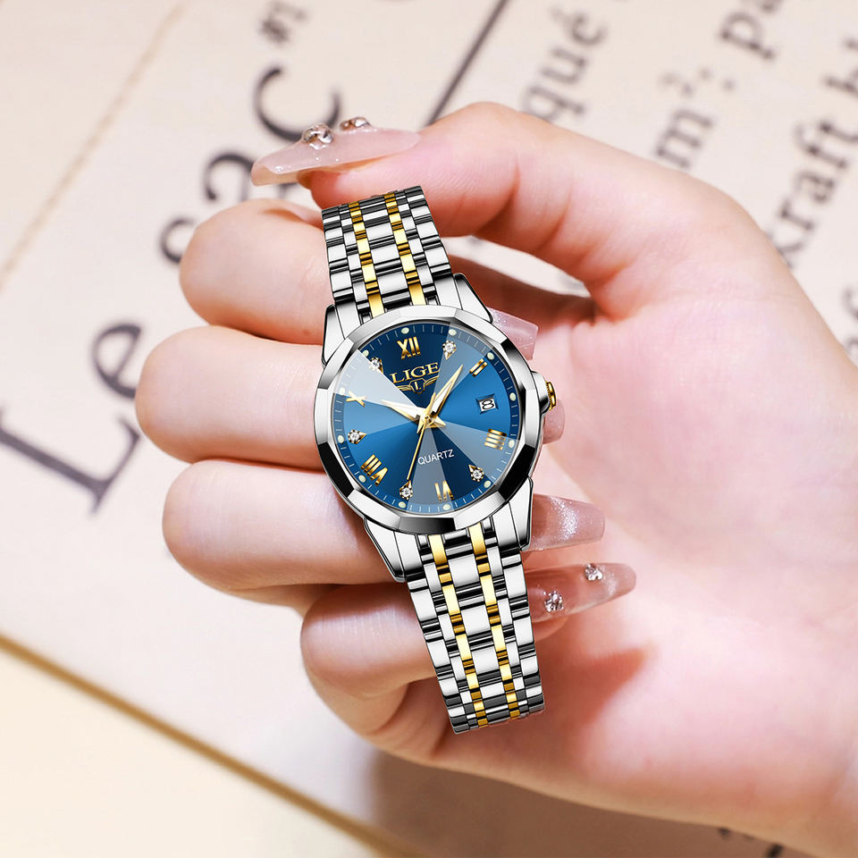 LIGE LG89157 Women Blue Gold Tone Bangle Watch Bracelet Set Necklace Ladies Casual Dress Watch Solid Stainless Steel Gift Box
