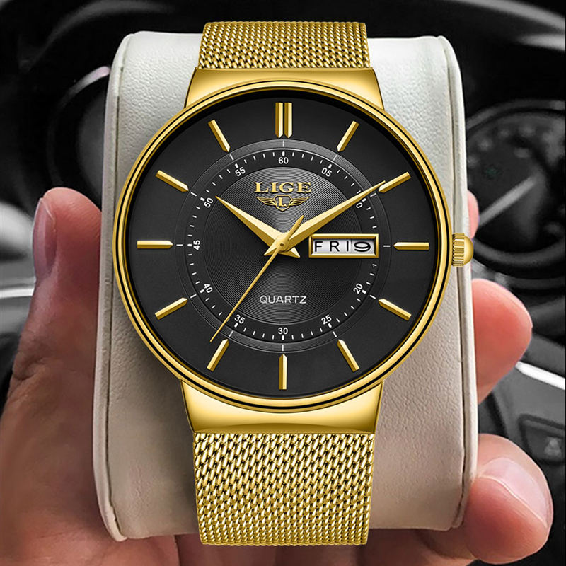 Montre-bracelet analogique pour homme LIGE LG9949, échantillon en acier doré, maille minimaliste, étanche, quartz, montres classiques de luxe pour hommes