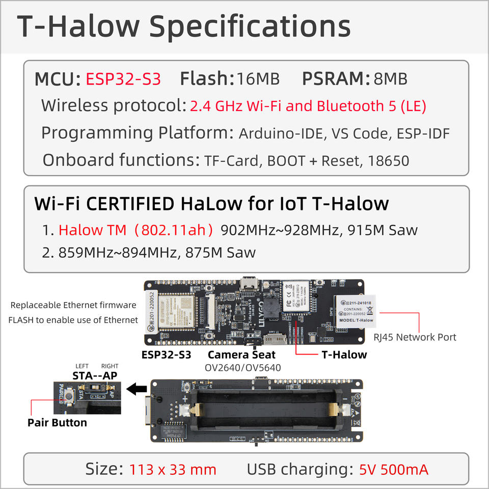 LILYGO T-Halow Module de scie Wi-Fi Halow 875M/915M ESP32-S3 + Port RJ45 + Caméra + Carte de développement IOT 18650 pour Arduin