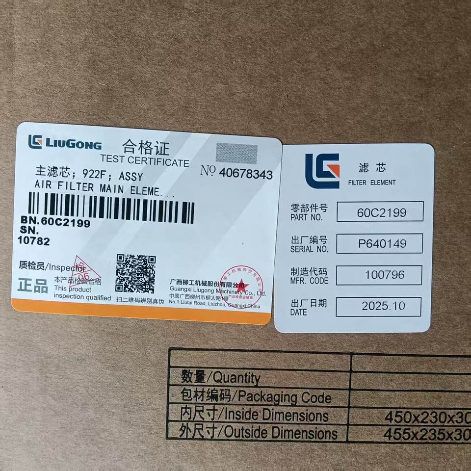 Élément de filtre principal LIUGONG 60C2199 pour pelle et chargeuse sur pneus