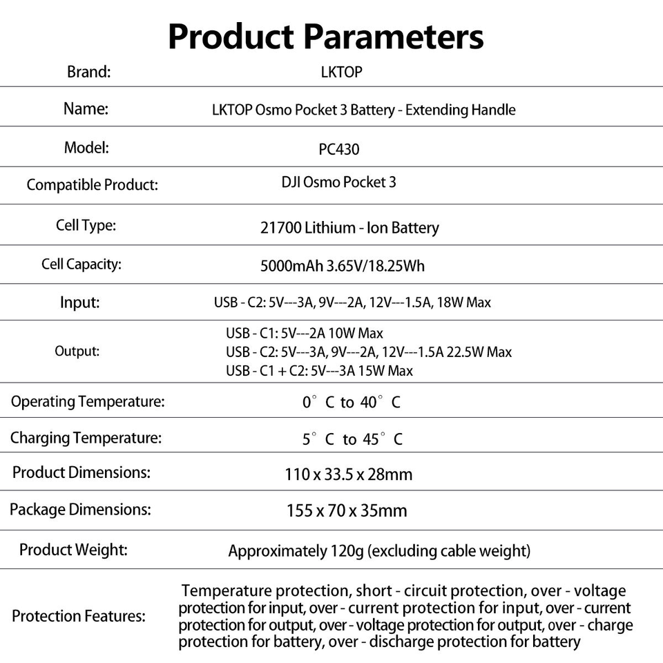 Poignée de batterie LKTOP 5000mAh pour DJI Osmo Pocket 3 - Autonomie prolongée de 6h, charge rapide 22,5W, double ports USB-C, montage 1/4 pouce