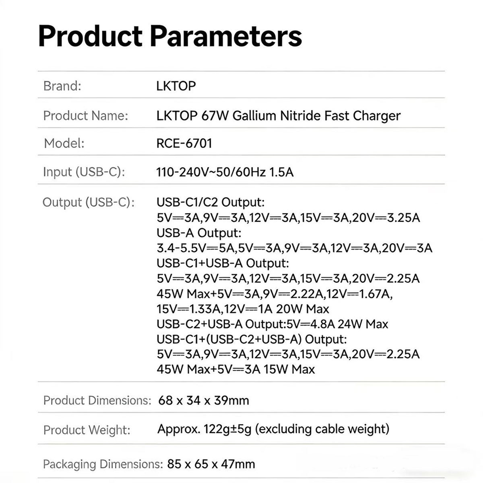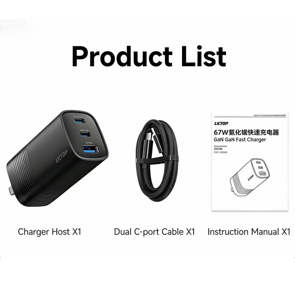 Chargeur rapide GaN LKTOP 67W (noir) - Chargeur compact 2 ports USB-C PD 3.0 PPS pour ordinateur portable/téléphone/tablette