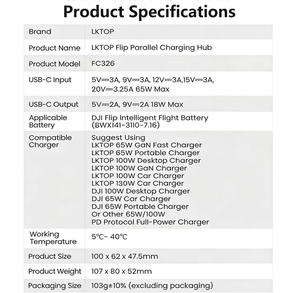 Hub de charge parallèle LKTOP Flip, chargeur rapide portable à 3 emplacements pour batteries de quadricoptères DJI avec rangement et affichage