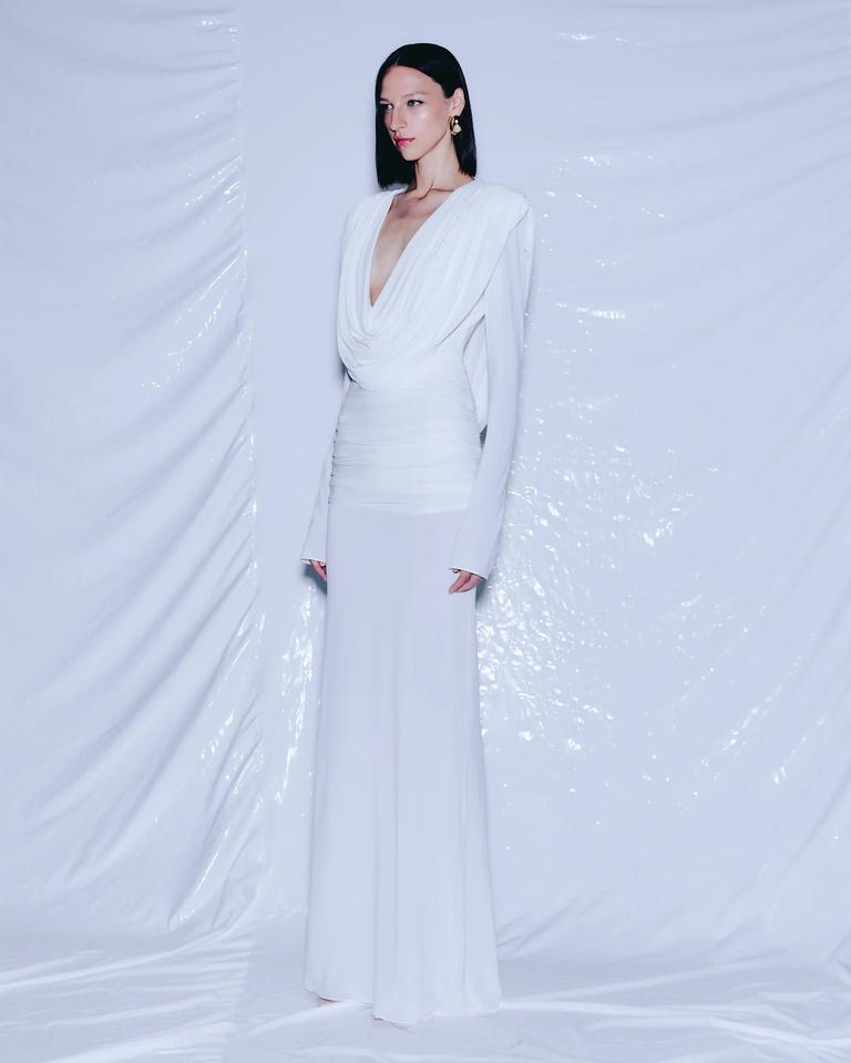 LM R569 Robe blanche personnalisée de haute qualité pour femmes, col en V profond, gaze mince, manches longues, haut de gamme, longueur plancher avec taille naturelle