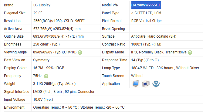 Interface:LVDS (4 canaux, 8 bits), connecteur à 92 broches