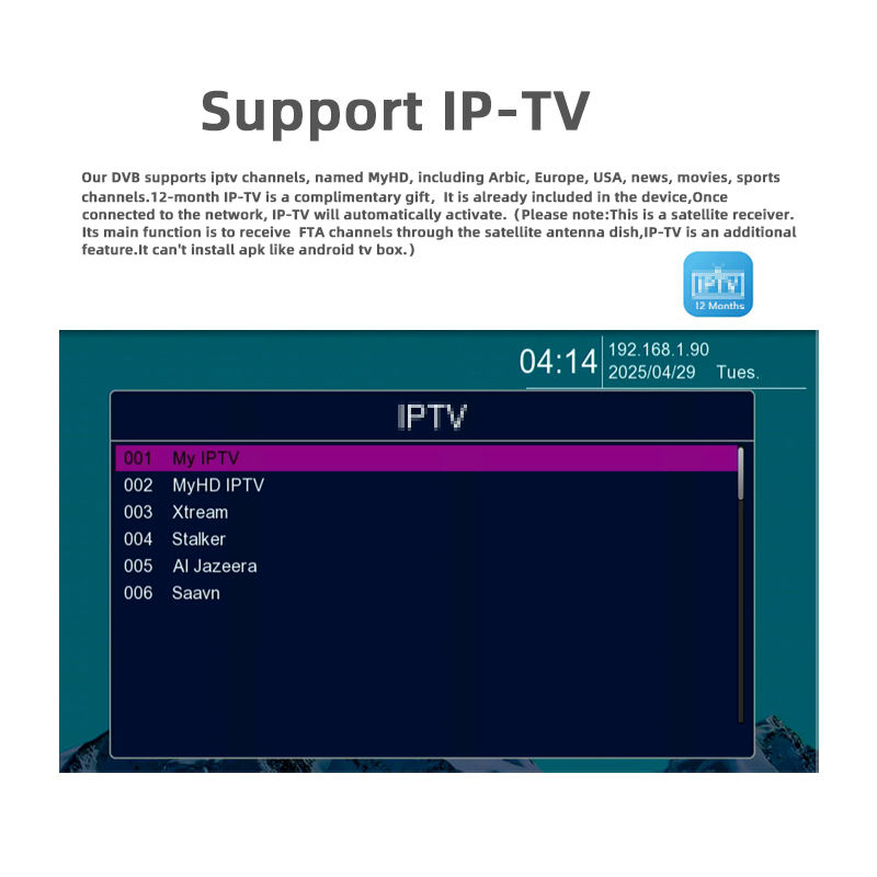 Main Function:MeeCast, DLNA, IP-TV, DVB2IP, Youtube, Tiktok, USB PVR, TimeShift, EPG