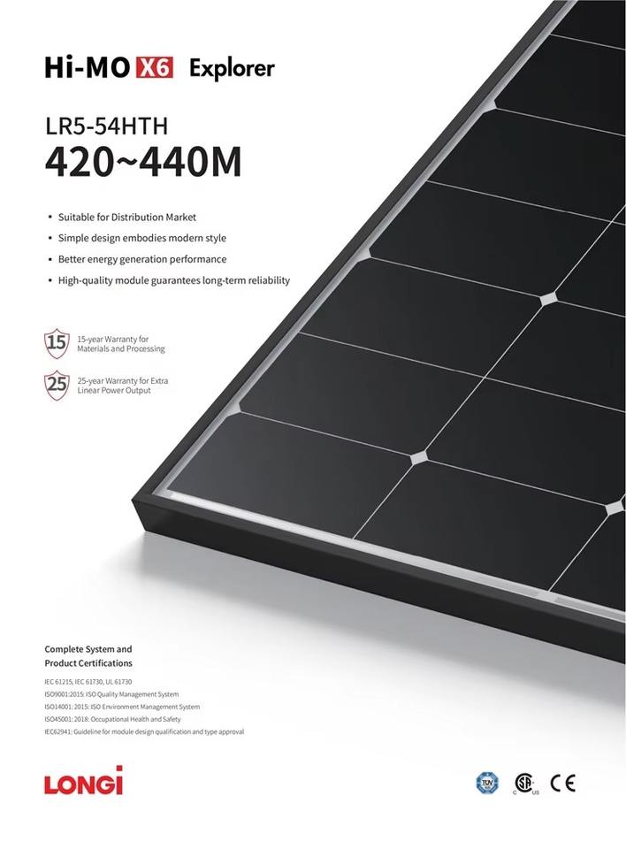 Panneau solaire LONGI Hi-MO X6 Explorer Series LR5-54HTH 420W à 440W Gamme de puissance Module haute performance avec technologie PERC