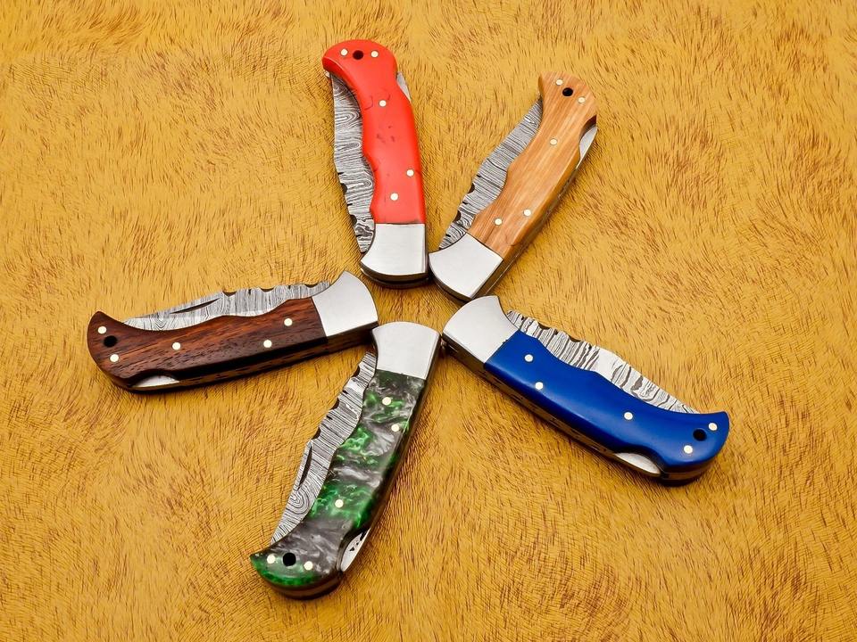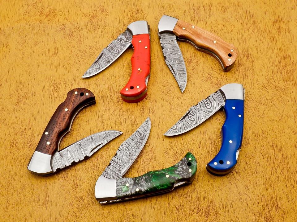 LOT de 5 couteaux de poche pliants en acier Damas faits à la main avec gaine Couteaux OEM personnalisables à usage industriel
