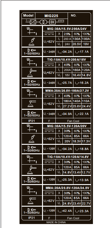 Tension De Sortie nominale (MIG):220V