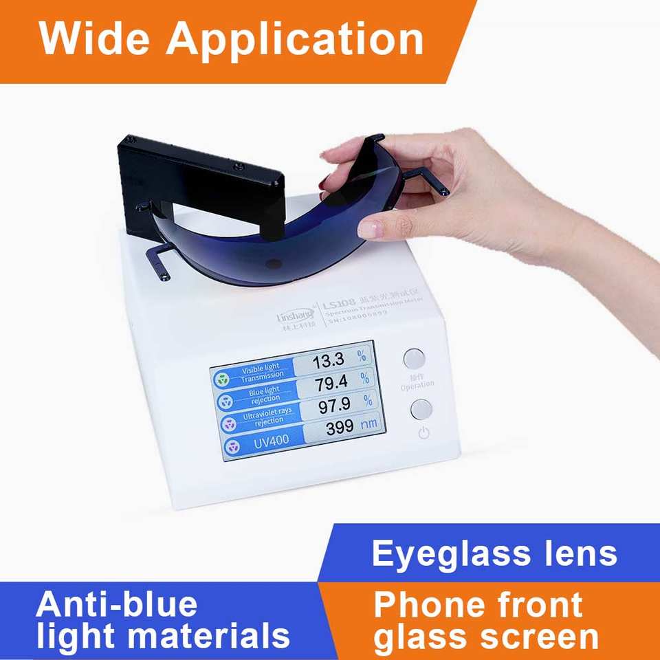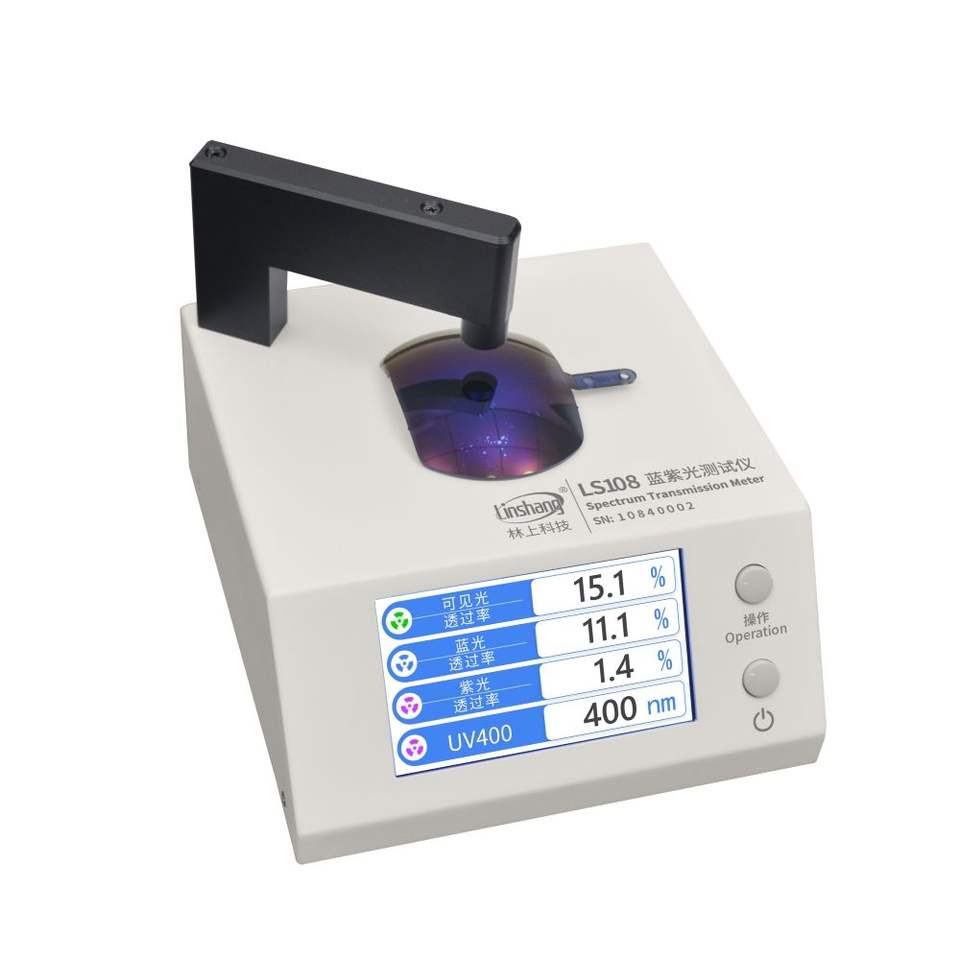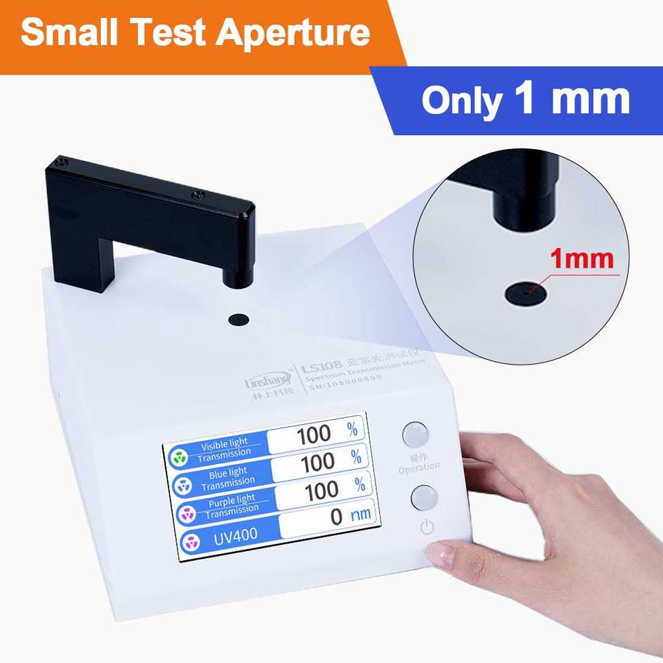 Le compteur de transmission spectrale LS108 teste la transmission des rayons UV400 / VLT / lumière bleue et violette avec une ouverture de test de 1 mm.