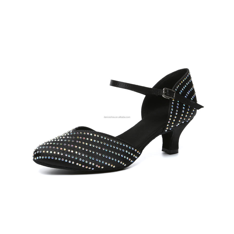 LUOQIAO Chaussures de danse de salon/latine en satin noir brillant avec strass, nouvelles chaussures modernes pour femmes à talon bas, débutantes, 5 cm, en cuir véritable