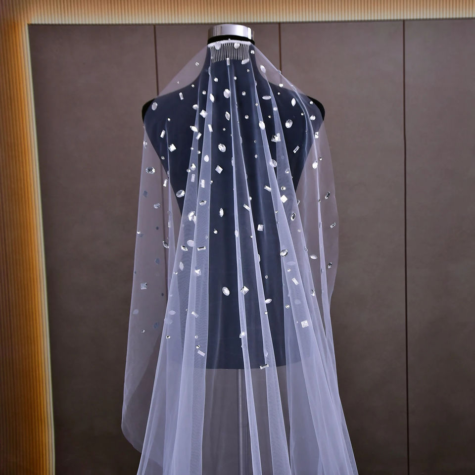 LUOXIN Luxury Wedding Veil Crystals Beaded Bridal Veils 1 Tier Tiara Rhinestone Soft Tulle with Comb