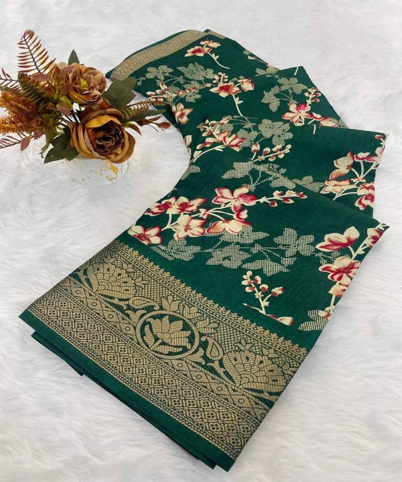 LUXURY DOLA SILK WITH JACQUARD BORDER PRINT WORK SAREE WITH UNSTITCHED BLOUSE WEDDING WEAR WHOLESALE PRICE ETHNIC GARMENT GREEN