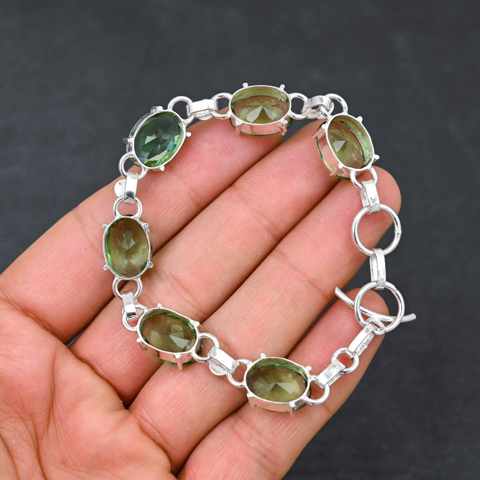 Améthyste verte de laboratoire 10X14 MM Bracelet ovale en argent sterling plaqué à la main avec 5 pierres de luxe certifié IGI 7-8