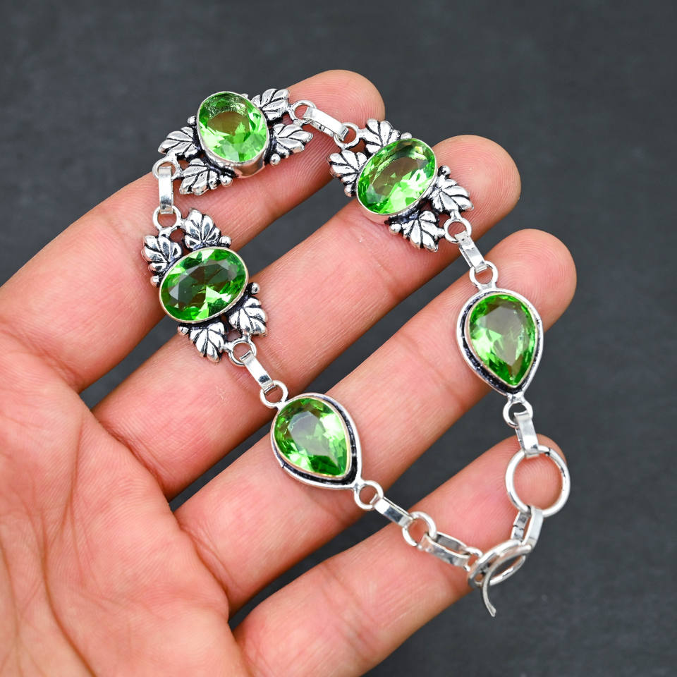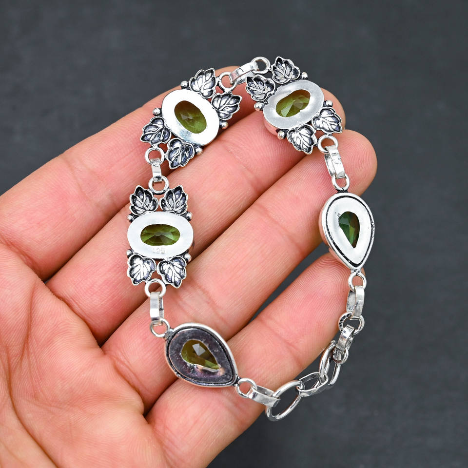 Lab-Created Green Peridot Gemstone 10X14 MM Oval Pear Handmade 925 Silver Plated 5-Stone Luxury IGI Certified Bracelet 7-8