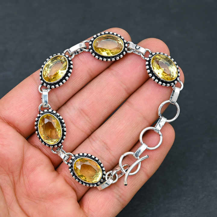 Bracelet en citrine jaune créé en laboratoire fait à la main en argent sterling plaqué IGI certifié bijoux de luxe designer pierres précieuses 7-8 "mariage