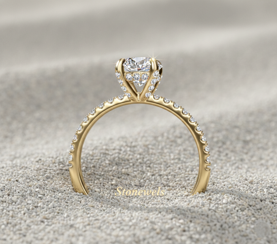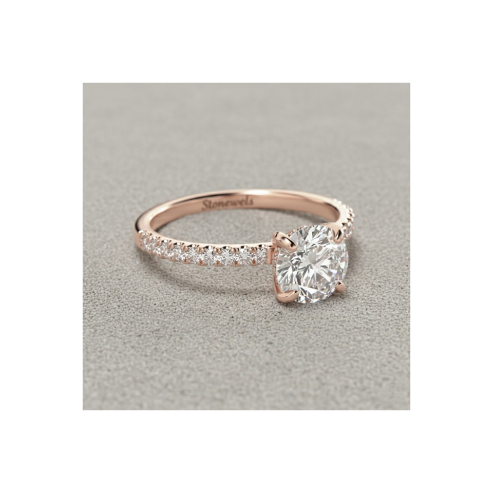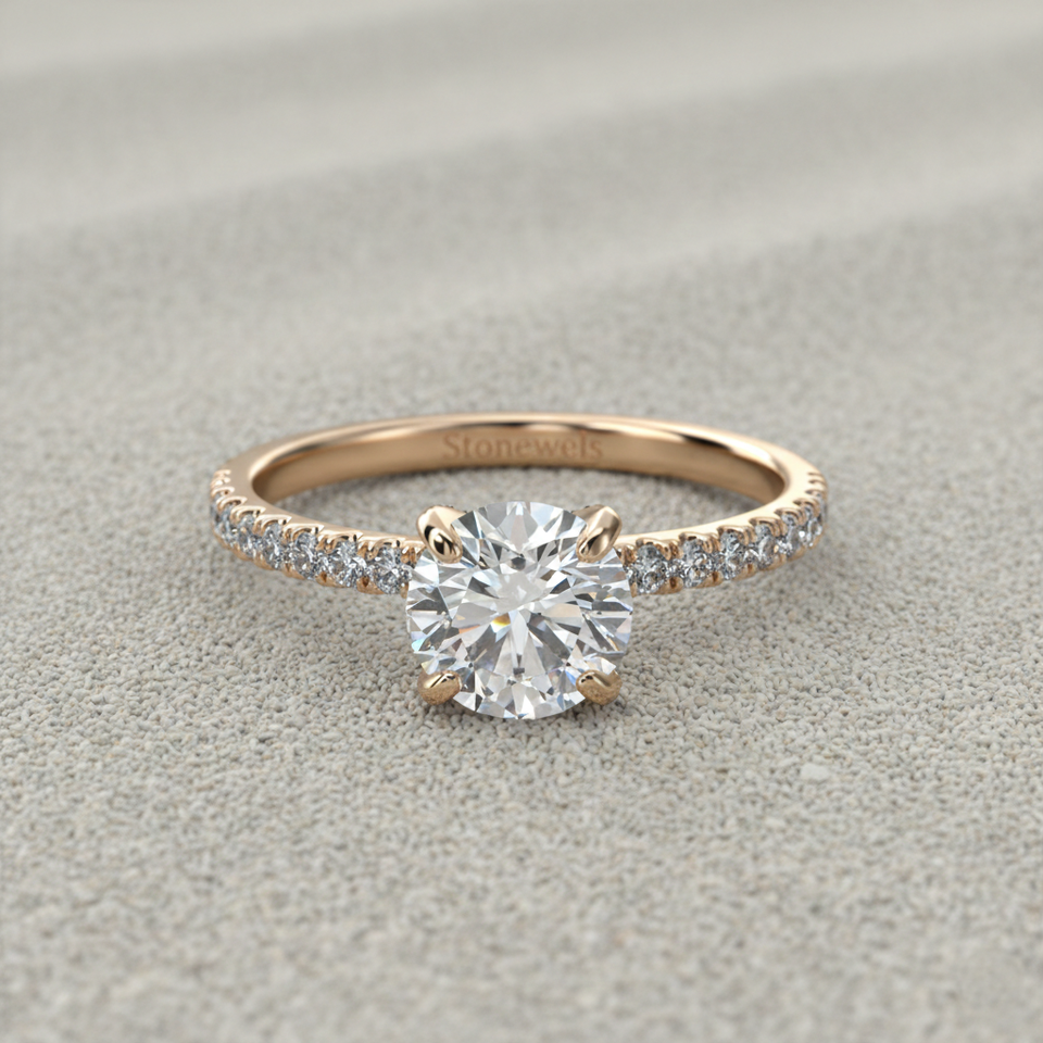 Bague de fiançailles en diamant de laboratoire, or rose 14 carats, taille ronde, petite couronne pavée, solitaire, fabricant de bijoux sur mesure