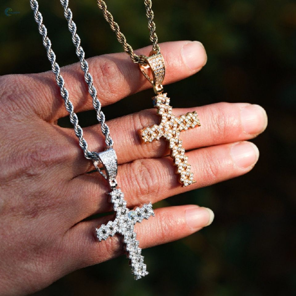 Collier pendentif croix serti de diamants de laboratoire, plaqué or massif, style hip-hop, unisexe, style célébrité