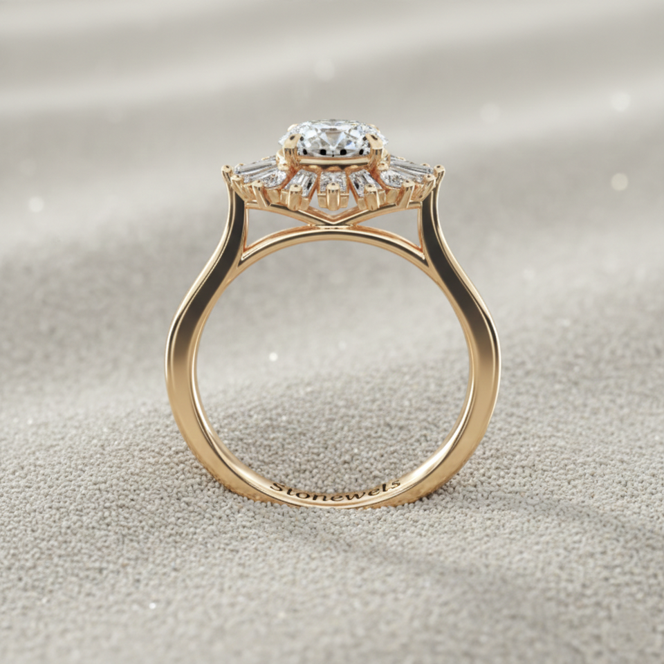 Lab Grown Diamond Rose Gold Plated Ballerina Halo Engagement Bridal Ring 14K Gold Cut Baguette Diamond for Certified Luxury