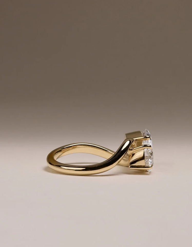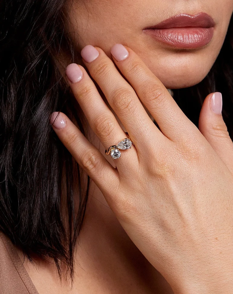 Bague de fiançailles en or massif 14 carats avec deux diamants de laboratoire, taille ronde et poire, style Toi et Moi, bijoux fins pour femmes, pour mariages
