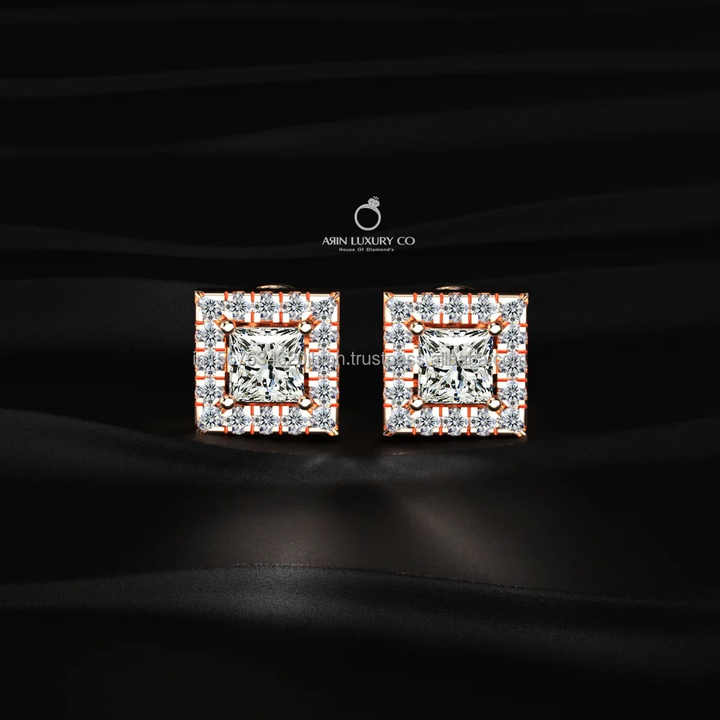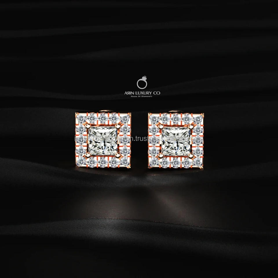 Boucles d'oreilles clous en diamant taille princesse cultivé en laboratoire, or rose 10K/14K/18K, halo carré, bijoux de luxe pour mariage pour femme