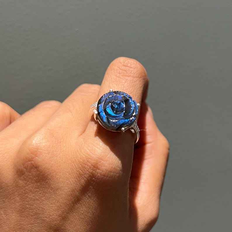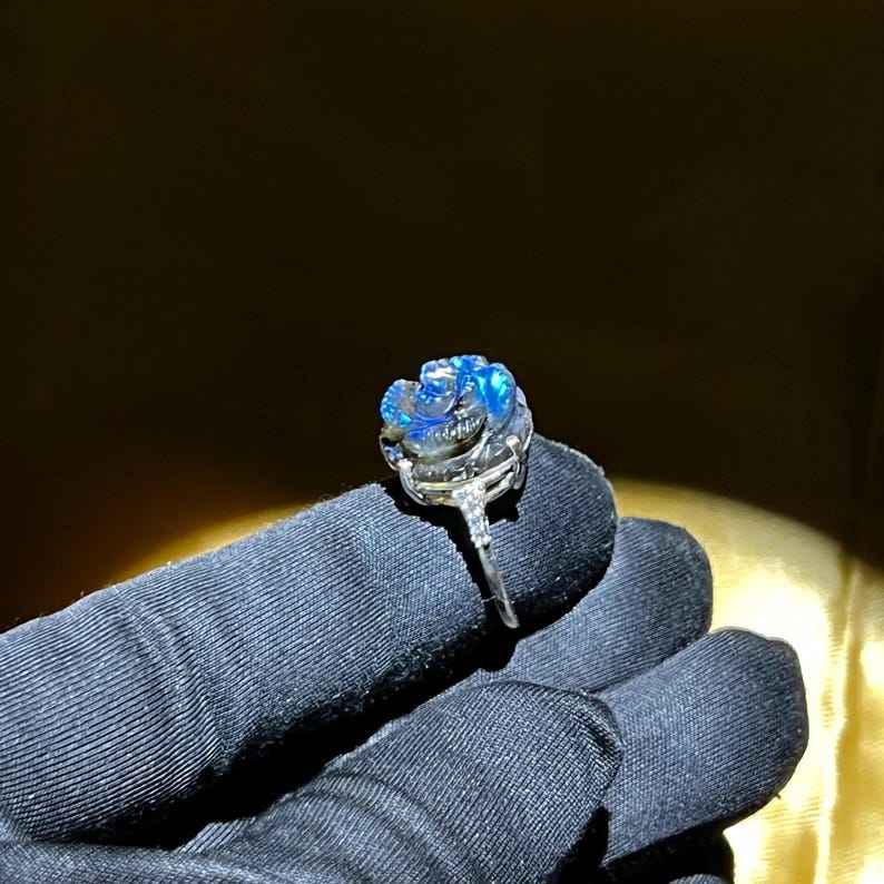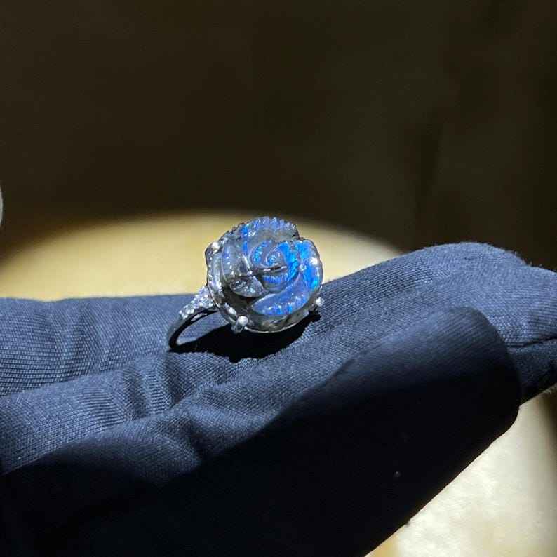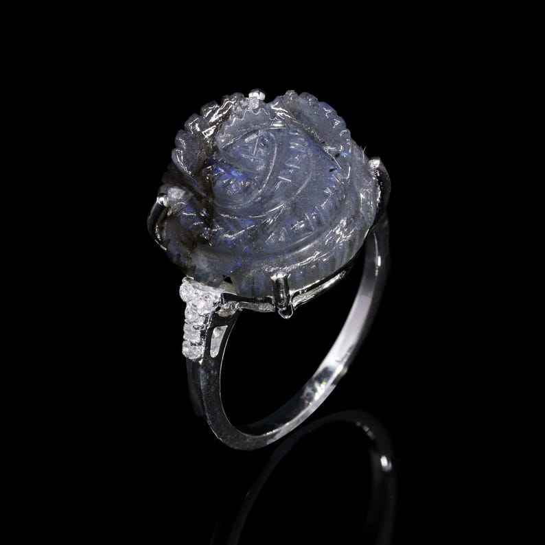Bague en forme de fleur sculptée en labradorite Bague Boho en argent sterling 925 avec pierre de labradorite de feu bleue CZ