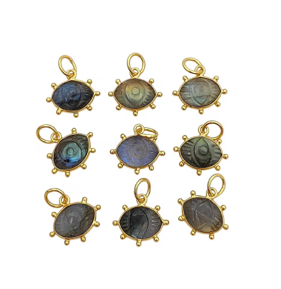 Pendentif en labradorite sculpté à l'œil, serti or fantaisie, breloque en argent sterling, pierre précieuse naturelle pour la création de bijoux DIY