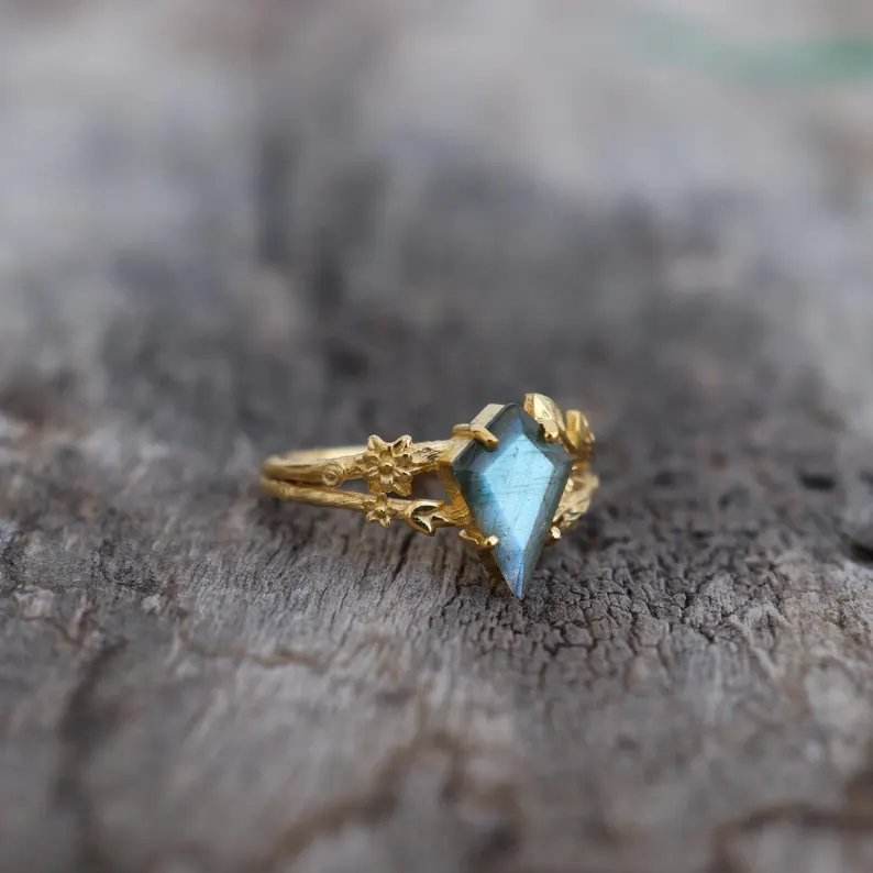 Bague en pierre de labradorite en argent massif 925 plaqué or 18 carats Bague de fiançailles pour femme, mariage et cadeau de Noël Bijoux fins
