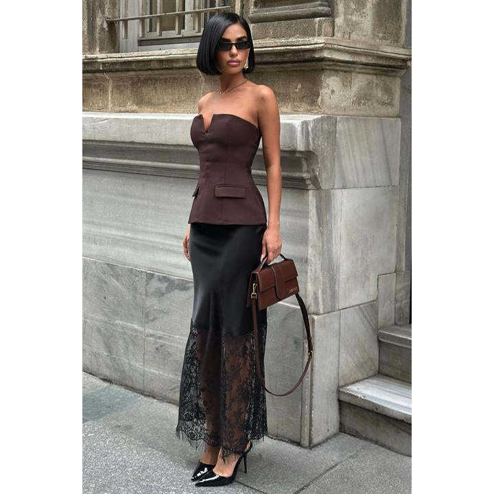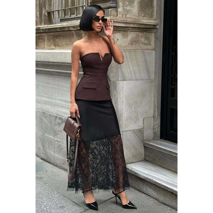 Lace Detail Satin Long Evening Dress Elastic Waist 4057-08