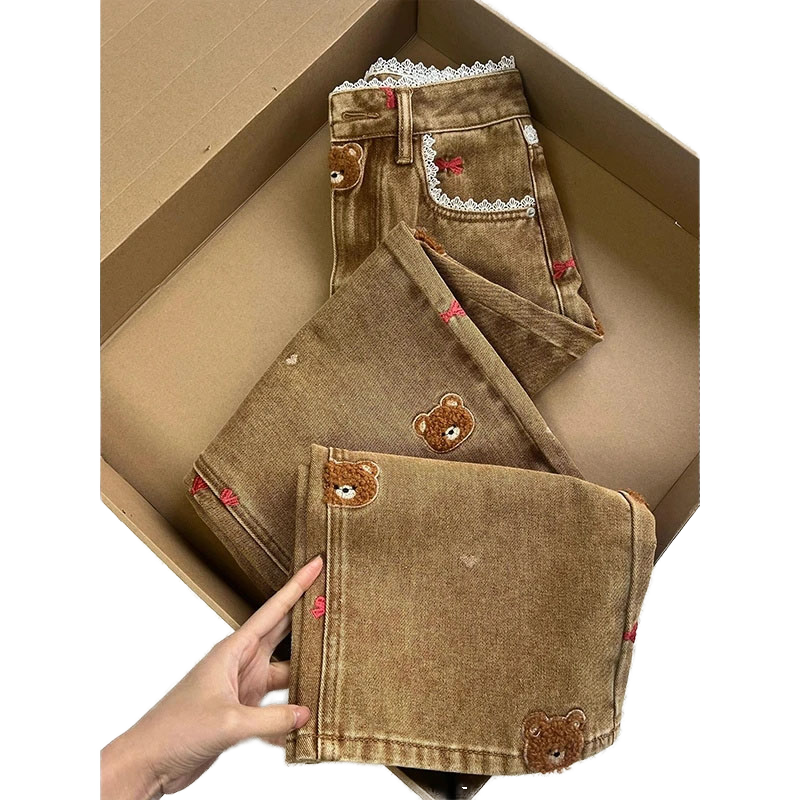 Jean large en denim de coton, style vintage délavé, avec patchwork brodé motif ourson en dentelle, résistant à la décoloration, coupe taille haute, collection automne