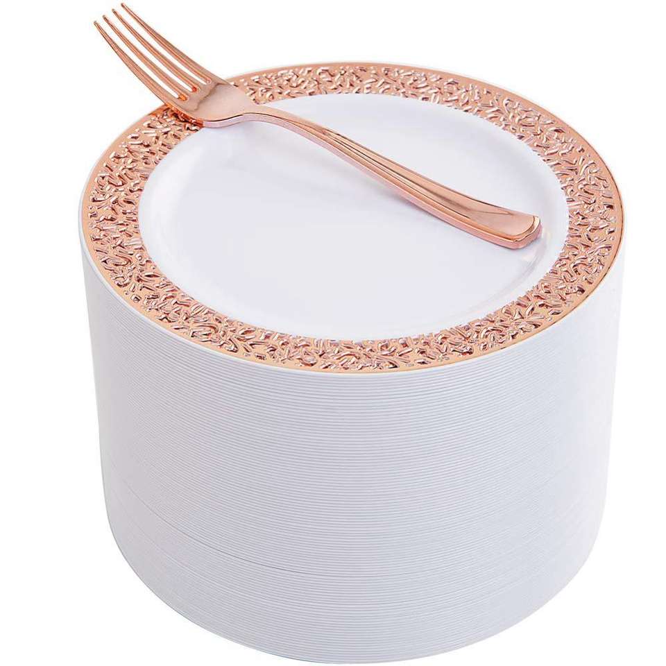 Service de vaisselle en dentelle comprenant 50 assiettes plates + assiettes à salade + tasses + serviettes + fourchettes + cuillères + couteaux