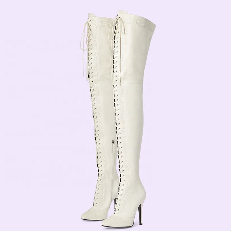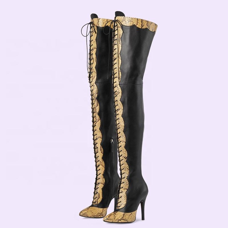 Bottes hautes à lacets patchwork pour femme, talons aiguilles, imprimé serpent, coupe large, taille 45