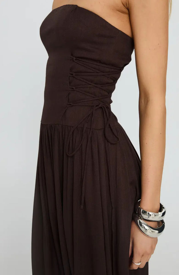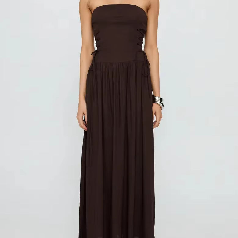 Robe longue marron sans bretelles à taille haute avec bande latérale et nœud décoratif, personnalisable en usine, pour le quotidien et les fêtes